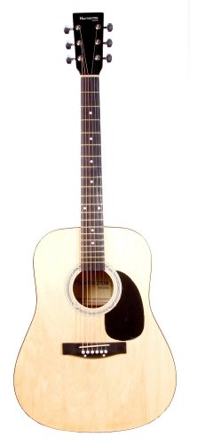 I wanted to purchase an inexpensive acoustic guitar for my 15 year old daughter to learn on and decided to take a chance on this Huntington that I saw on Amazon. Cost less than a hundred bucks but was a nicely made instrument with an attractive tobacco sunburst body. The neck is very good and quite slender for that of an acoustic. Personally, it's slightly too slim for my taste but perfect for the smaller hands of a young beginner. Soundwise it's somewhat brighter than the average dreadnaught, sounding not unlike an Ovation roundback. Normally when I buy a cheap guitar I have to do some work on it to make it playable, but this one needed nothing done to it except to tune it up and start playing. Also has good tuners and seems to keep in tune very well Nice enough for me to be tempted to take it out onstage or at least to a campfire or two. Comes with a half-decent gig bag, strap, pitch pipe and extra strings. All in all a fine instrument for the beginner or many professional players...