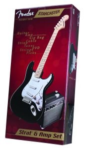 Fender Starcaster Strat Packs deliver a great-sounding, sleek-looking Stratocaster electric guitar paired with a compact but still-mighty guitar amplifier and a host of essential accessories. This Strat Pack includes a black Stratocaster guitar, strings, picks, a strap, Squier SP-10 amp, and a 10-foot cable Stratocaster GuitarThe highly versatile Stratocaster guitar offers legendary Fender tone combined with classic styling, and it's suited for all styles of music. It features a 22-fret rosewood fingerboard with dot position inlays, three single-coil pickups with 5-way switching for the Strat's trademark tonal variety, sealed die-cast tuners for consistent tuning stability, chrome hardware and a three-ply white pickguard. The synchronous tremolo bridge can be used for subtle shimmery manipulation of chords or hard-core whammy-bar excursions. You'll also get a wide range of tones from the single volume and dual tone controls. Squier SP-10 AmplifierThe Squier SP-10 amp controls include volume, treble, bass, and an overdrive on/off button that delivers tube-like tone. A headphone output allows silent practice. It features a 6-inch speaker, 10-watt drive, and a tough, textured vinyl exterior. ...And Everything ElseNo need to shop for the accessories as they're all included. The package includes an extra set of strings, some guitar picks, a strap, and an instrument cable.