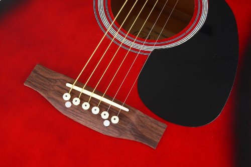 This 41" full-size dreadnought acoustic guitar set is ideal for the beginning to intermediate musician. It has a loud and bright ringing tone that clearly projects to the listener. The steel string guitar is perhaps the most versatile and common guitar type; it it the backbone of most country and bluegrass bands. This type of guitar is perfect for backing a singer, and its stylistic palette encompasses everything from new age and country blues, to hot bluegrass flatpicking, jazz fusion, and "unplugged" rock.