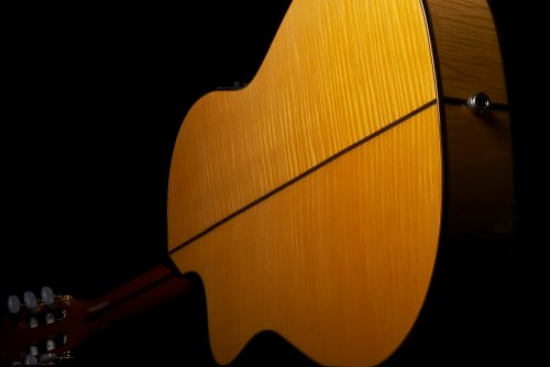 - Solid European spruce top with flamed maple back and sides