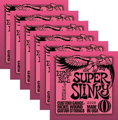 Gauges 9-11-16-24w-32-42. Nickels are the most popular of the Ernie Ball Slinky guitar strings. They're made from nickel-plated steel wire wrapped around tin-plated hex-shaped steel core wire. The replacement strings produce a well-balanced all-around good sound. Ernie Ball strings are precision manufactured to the highest standards and most exacting specs to assure consistency, optimum performance, and long life. Ernie Ball is the pioneer of rock and roll guitar strings. Jimmy Page, Eric Clapton, Steve Vai, and Slash are among the long list of Slinky players......