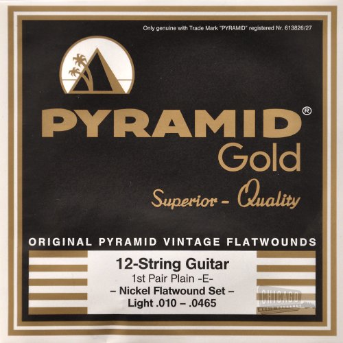 Pyramid Gold Nickel Flatwound Light electric guitar strings. Strings are pure nickel flat wound, light gauge. Great smooth feel, superb tone and timbre. Made in Germany. These have been called light gauge in the past. Red silk end. Gauges: 010/010 012/012 010/019w 013/030w 019/035w 030w/0465w